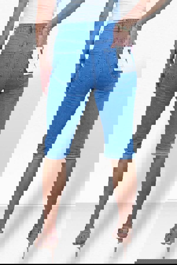 Get summer-ready with our Women's Knee Length Denim Capri Shorts – a stylish blend of jeans and shorts in a flattering slim fit. These high-waisted capri jeans are designed to sit comfortably at the waist, hugging your curves all the way down to the knee. Made from stretch denim for a body-contouring fit, they offer more coverage without sacrificing style. The turn-up hem can be rolled down for extra length, and the slim fit design ensures a sleek silhouette. Available in UK sizes 10 to 22 – our model is 5'7" and wearing a size 12.