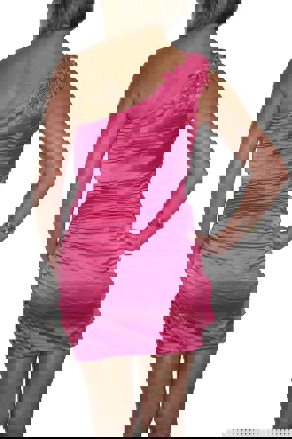 This satin slim fit dress is the perfect combination of elegance, fun and style, great for dancing the night away! The ladies dress is made from a soft satin fabric offering a beautiful shiny sheen, great for parties! It is fully lined providing your skin an indulgently luxury feel and more structure to the outfit. The bust has padded cups not only for comfort but for a smoother surface. Packed with roman charm, the front is layered and has a chiffon sash effect elegantly falling from the waist. There is a rose detail one shoulder strap defining your neckline and enhancing your shoulders. This glam mini dress is a body hugging design designed to emphasis your silhouette. For easy fastening this party dress is fashioned with an invisible side zip for a tidy look. This short dress has a total length measuring 32"-33" (82cms-84cms) from shoulder down.