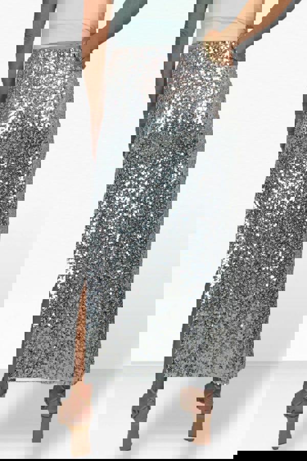 Elevate your style with our Women's Stretch Sequin Maxi Skirt, crafted from a stretch all-over sequin fabric that glitters with every movement. Featuring a fused-on lining for a smooth, comfortable feel, this skirt is designed for ease with a pull-on style and a stretch contrast tape waist. The standout open side leg slit starts approximately 12" (30 cm) from the waist, adding a touch of allure. The skirt is about 35. 5" (90 cm) in length, varying slightly as it hangs. Our model is 5'7" (170 cm) and wears a size M. Perfect for parties, special occasions, or a night out. Shine bright and make a statement with every step.