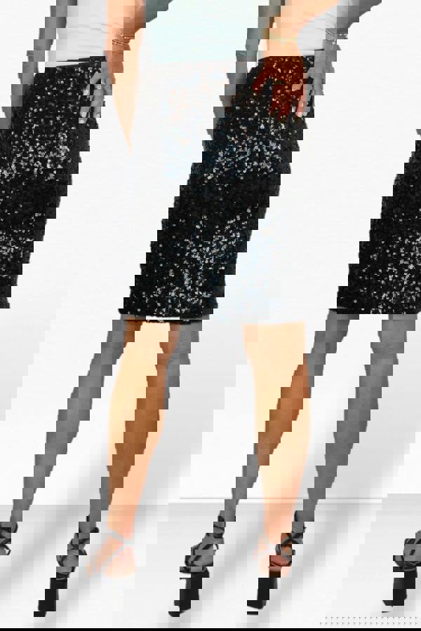 This stunning women's stretch sequin mini skirt is designed to dazzle. Perfect for any night out or special occasion, it features an all-over sequin design that catches the light beautifully. The stretchable fabric ensures both comfort and a flattering fit, while the contrast tape around the waist adds a stylish touch. With no zipper, it's easy to pull on and wear. The skirt length averages about 20 inches (51 cm). Our model, 5'7" (170 cm), wears a size M.