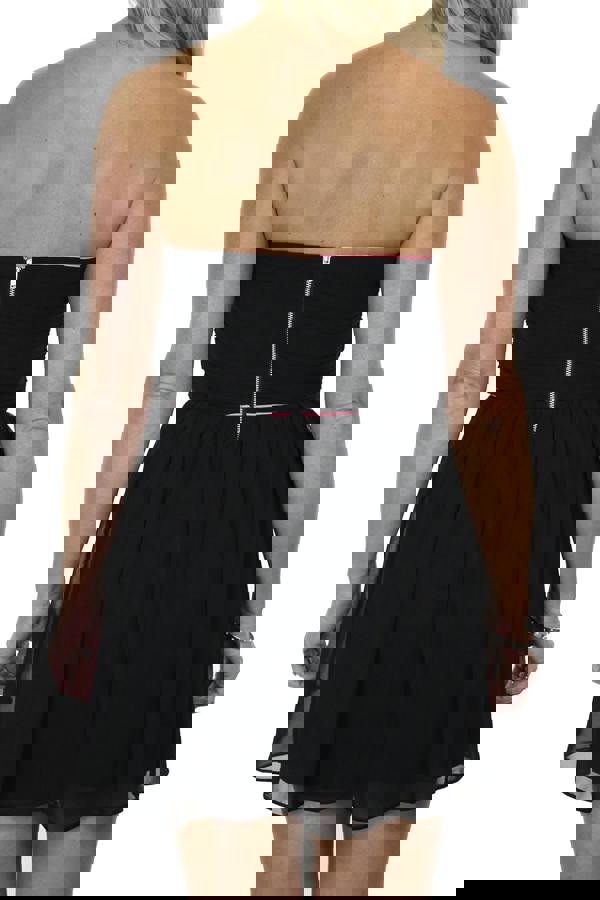 This ladies strapless dress is made from a soft chiffon to give you an indulgently soft feel that also brings you comfort for the duration of wear. The bandeau mini dress has a length from the bust down of 25" (64cms). This short dress has a sleeveless design to emphasis your shoulders. The bust has pleats which flow with movement and have slightly padded cups. This is fully lined to prevent it from being see through. This lightweight dress has a back silver zip for easy fastening. There is contrast piping detail at the front continuing onto the back.