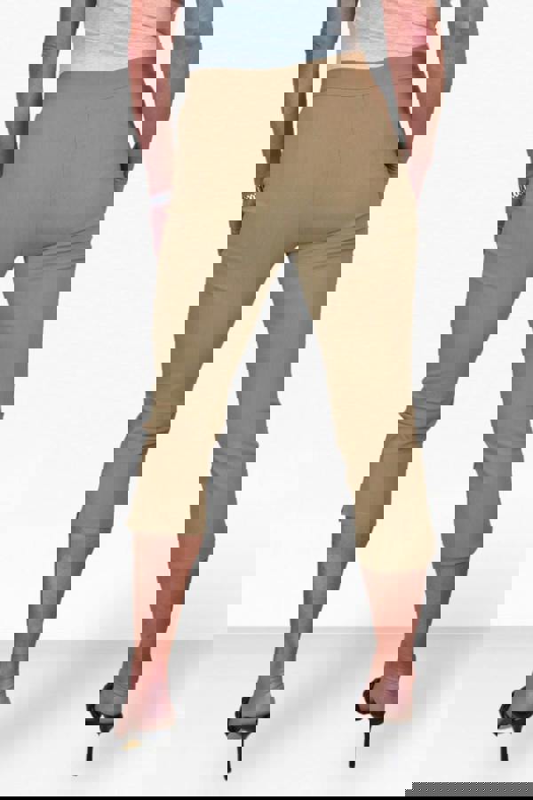Cropped stretch trouser from Paulo Due. These ladies slim fit pedal pushers have an inseam length of 21" (54cms) which makes them great for everyday! A basic wardrobe essential that everyone needs. Our bestselling capri trousers are a staple style for all year round. With over 15 colours available, mix and match tops and crops for an quick and easy stylish outfit. These high waisted trousers will take you from day to night with ease, whether you are packing them in your suitcase for a summer holiday or dressing up with a blouse for an evening outdoor party. The perfect go to style, wear your crops for casual days, for special occasions as well as uniform and laid back office wear! These stretchy trousers are cropped at a flattering 3/4 mid-calf length and with a button and zip fly closure. At the bottom cuff, there is a cute side split for detail that adds to the relaxed and comfortable fit.