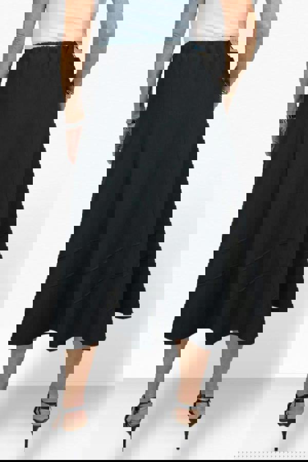 A smart skirt is essential for your wardrobe, whether for a meeting, interview (great first impressions), a day in the office, or other smart formal events. This Women's flared skirt is midi length that falls around your mid-lower calf – portraying a very professional look. Made from a medium weight suiting type material making it suitable for many occasions such as office, work, business as well as every day and evening. Around the bottom section is a pintuck stitch detail design giving this long skirt a smart and elegant look. A fully elasticated waistband (hidden) creates a comfort and a non-restrictive feel so that you can wear all day long. – There is no zip so this pulls up over your hips. Made up of 6 panels creating an A line swing design, The women's below knee skirt is fully lined to add structure and provide comfort with a premium feel. This ladies office skirt looks great on all body types thanks to its easy fitting and flattering front length measuring 30-31" (77-79cms). Our model is 5'7" wearing size 12.