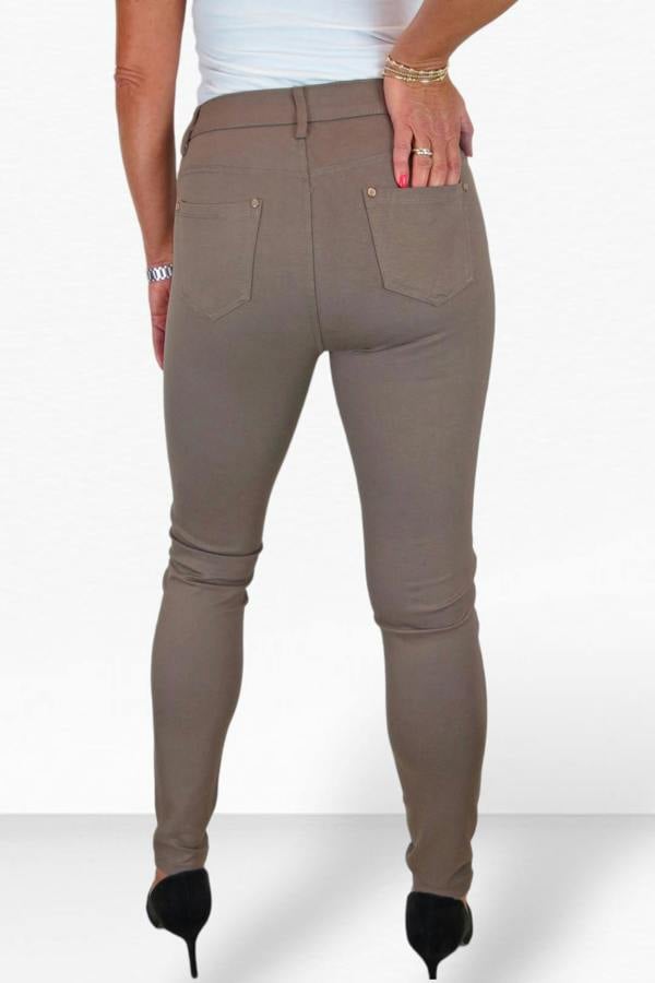 Find your new go to all year round trouser! These are high waist skinny leg jeans style trouser that have generous stretch to hug your curves. The pants fabric is ponte roma that is a double knit thick jersey, smooth with slight sheen and have 4 way stretch for ease when putting on and comfort through the day. These slim pants have the classic 5 pocket design, 3 on the front and 2 on the back, all large enough for your essentials. The waist band has belt loops so you can add a belt of your choice. To fasten the jeans there is a self colour stud button and a zip fly. Our ladies trousers are a tight fit, fitting like a legging, but also smart enough for a trouser. They have an inside leg of 29”, but due to the fabrics stretch and skinny fit, they will easily stretch with your leg to be worn longer. Our stretch trousers are perfect for all occasions and great for traveling at airports, in the car and everyday!