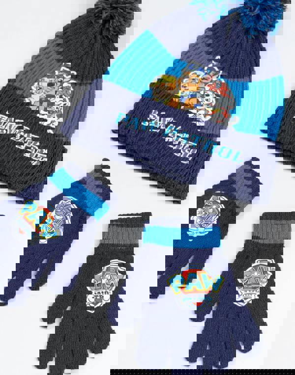 This awesome set combines style and function, featuring everyone's favourite pup pals: Chase, Rumble, and Marshall! The beanie is a vibrant blue, topped with a playful pom pom that adds a touch of fun to their winter attire