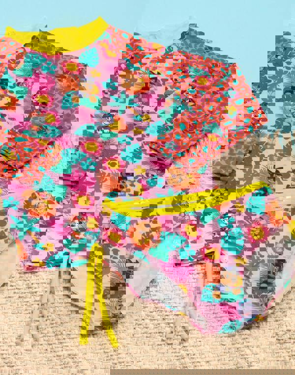 This fun two-piece swimsuit for children and toddlers comes in pink and yellow featuring Skye, Marshall, and Everest surrounded by floral foliage and an animal print