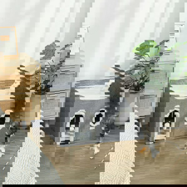 A cosy hideaway your feline friends will adore, this PawHut cat house features soft plush and linen-look fabric, gentle on paws and stable. Three side openings allow for playful darting, peaceful naps or quiet alone time, while the raised bed offers comfort and a vantage point to watch the world go by. The sisal scratch pad keeps claws healthy and away from your furniture. Easily fold it for compact storage and travel, giving your pets a comfortable space wherever you go.