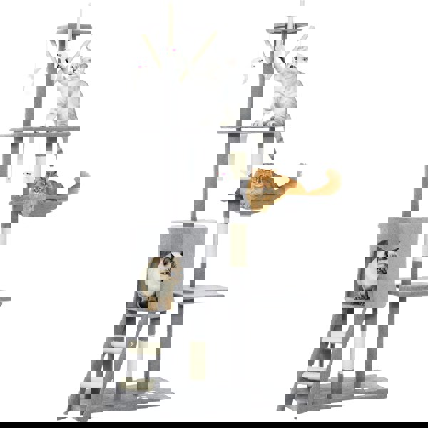 It features mouse toys for fun, sisal posts for scratching, a plush-covered house for naps and platforms for observing.