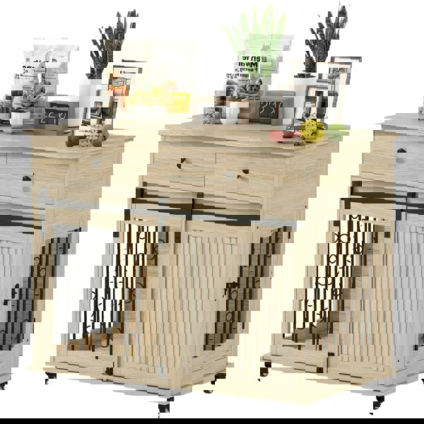 When you need some pet-free time, the PawHut dog cage comes in handy. Suitable for medium and large dogs, it features a sliding barn door and a side door with a lock for secure access. With five rolling castors, it moves effortlessly around your home. The spacious tabletop can hold ornaments or pet supplies, with two additional drawers for extra organisation. Whether you're out, hosting guests or busy in the kitchen, you can rest easy knowing your pet is secure and comfortable.