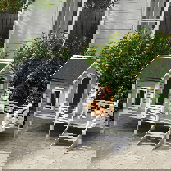 All dog houses for medium dogs and small dogs alike could benefit is that: a porch. By expanding the grounds of this PawHut shelter with a sunny patio, the divided layout makes this dog house a big place for fun. The spacious space, water-resistant solid protection and window this wooden dog house offers create a roomy place that can become dog heaven. With a raised floor and black railing, this rustic wood cabin house for animals adds beauty to your space.
