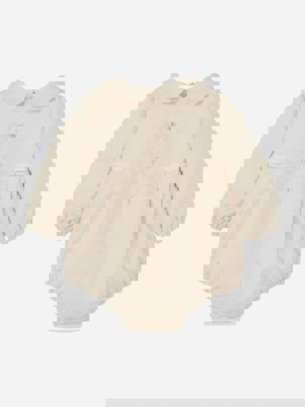 Introduce elegance to your little one's wardrobe with the Paz Rodriguez Baby Girls Cotton Romper in Beige. Luxuriously crafted in Spain, this piece encapsulates comfort and chic style for AW2025. Consider the exquisite features: