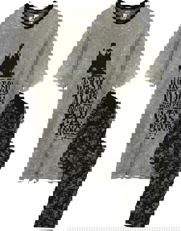 The men's Peaky Blinders pyjama set comes with a stylish grey acid wash t-shirt and black drawstring trousers perfect for chilling and watching your favourite crime series, The Peaky Blinders with the Shelby Brothers! The edgy grey Peaky Blinders top features a silhouette print of fan favourite character, Tommy Shelby with a bold print reading 'GARRISON TAILORS BY ORDER OF THE PEAKY BLINDERS' making an awesome gift for Peaky Blinders fans
