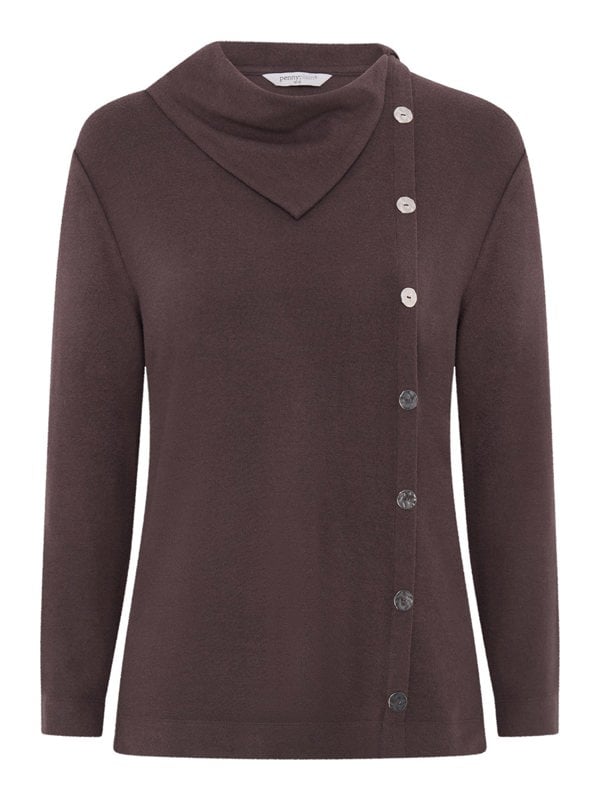 Both classic and contemporary, our dark latte split cowl neck top features button detail running down the front to hem, side slits and also comes with metal tab at the hem.