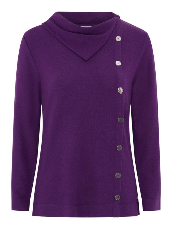 Both classic and contemporary, our mulberry split cowl neck top features button detail running down the front to hem, side slits and also comes with metal tab at the hem.