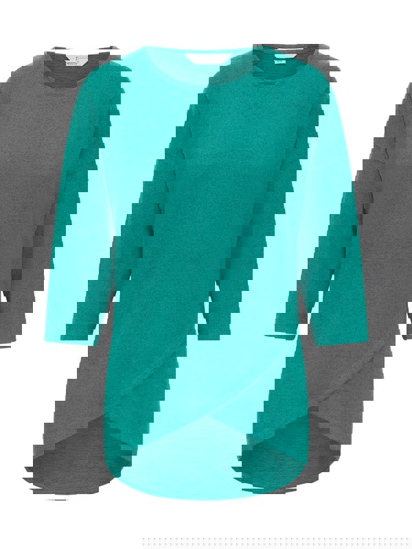 This soft brushed, crew neck jersey is a perfect everyday piece. This top features three quarter length sleeves, a front cross over asymmetric hem in a azure blue shade.