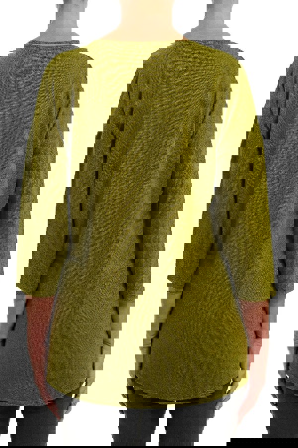 This soft brushed, crew neck jersey is a perfect everyday piece. This top features three quarter length sleeves, a front cross over asymmetric hem in a forest green.