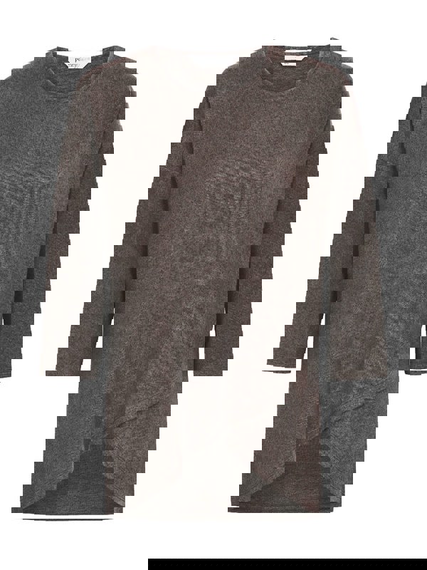 This soft brushed, crew neck jersey is a perfect everyday piece. This top features three quarter length sleeves, a front mock asymmetric hem in a taupe grey.
