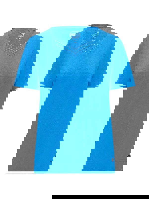 The perfect wardrobe essential. Our new sweetheart neck top in Pacific Blue, features short sleeves, side slits and metal tab. Finished in 2-layer diamante embellishment around the neckline.