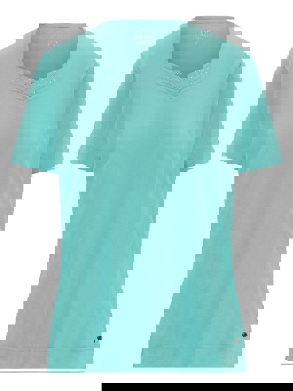 The perfect wardrobe essential. Our new sweetheart neck top in turquoise features, short sleeves, side slits and metal tab. Finished in 2-layer diamante embellishment around the neckline.