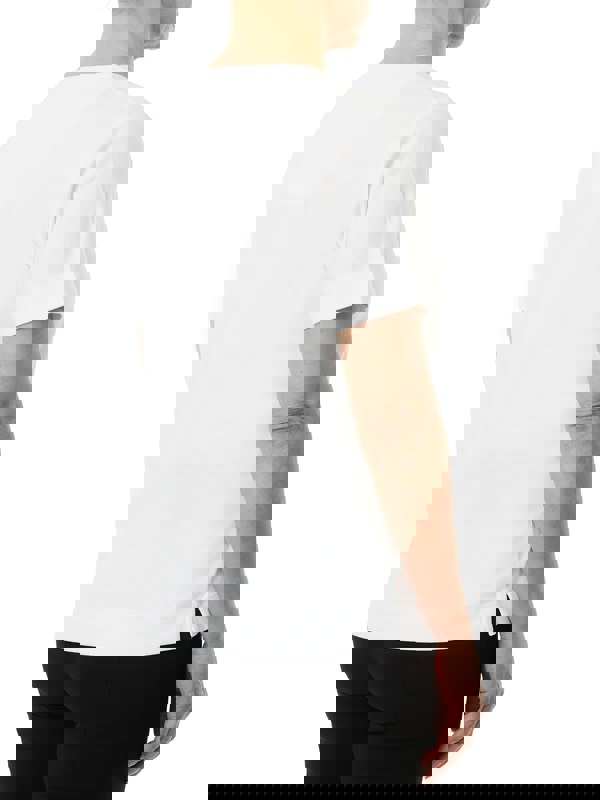 The perfect wardrobe essential. Our new sweetheart neck top in white features, short sleeves, side slits and metal tab. Finished in 2-layer diamante embellishment around the neckline.