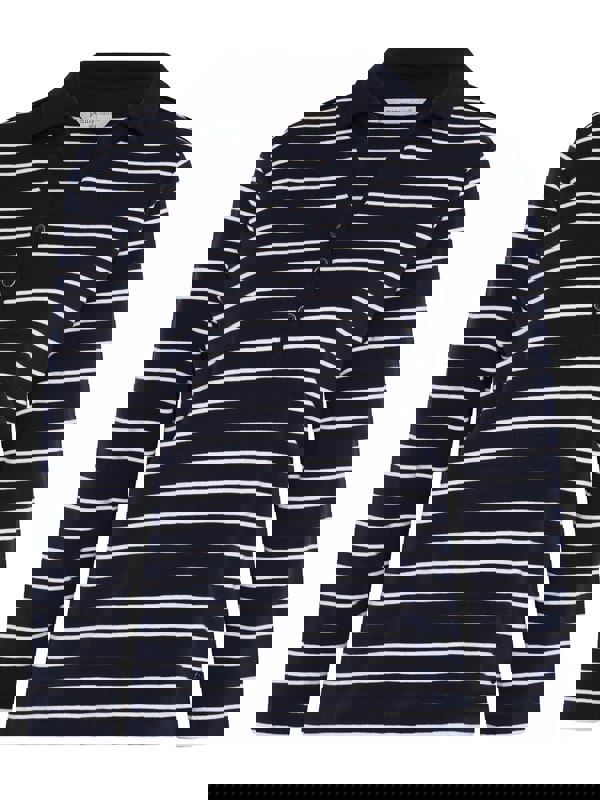 Our French Navy/Ivory yarn dye stripe Henley top is a stylish choice for smart-casual days. It's cut in a flattering shape, with a neat solid dye collar and notch neckline + long sleeves. The versatile piece is complete with a smart 3-button placket.