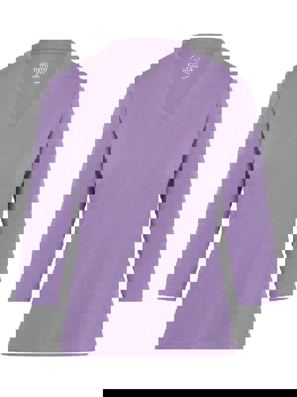 The perfect wardrobe essential. This tops comes in beautiful light amethyst and features three quarter length sleeves, a double layer front and a metal tab.