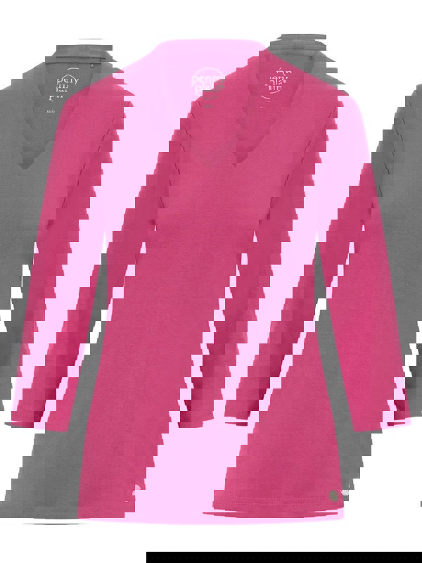 The perfect wardrobe essential. This top comes in beautiful cerise and features three quarter length sleeves, a double layer front and a metal tab.