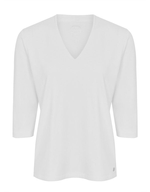 The perfect wardrobe essential. This top comes in beautiful ivory and features three quarter length sleeves, a double layer front and a metal tab.