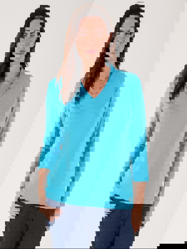 The perfect wardrobe essential. This top comes in beautiful lagoon and features three quarter length sleeves, a double layer front and a metal tab.