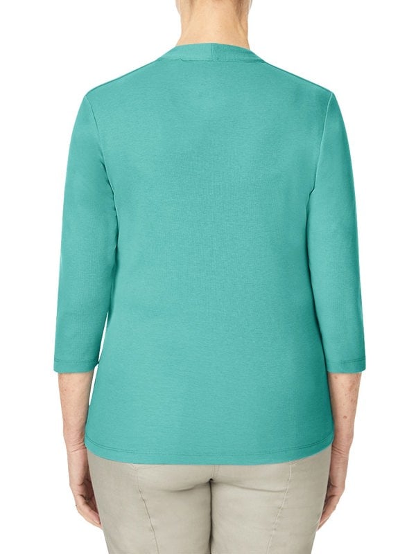 The perfect wardrobe essential. This top comes in beautiful sea green colour and features three quarter length sleeves, a double layer front and a metal tab.
