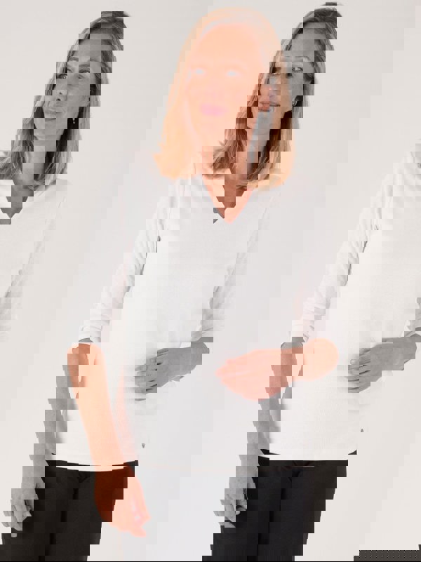 The perfect wardrobe essential. This top comes in beautiful white and features three quarter length sleeves, a double layer front and a metal tab.