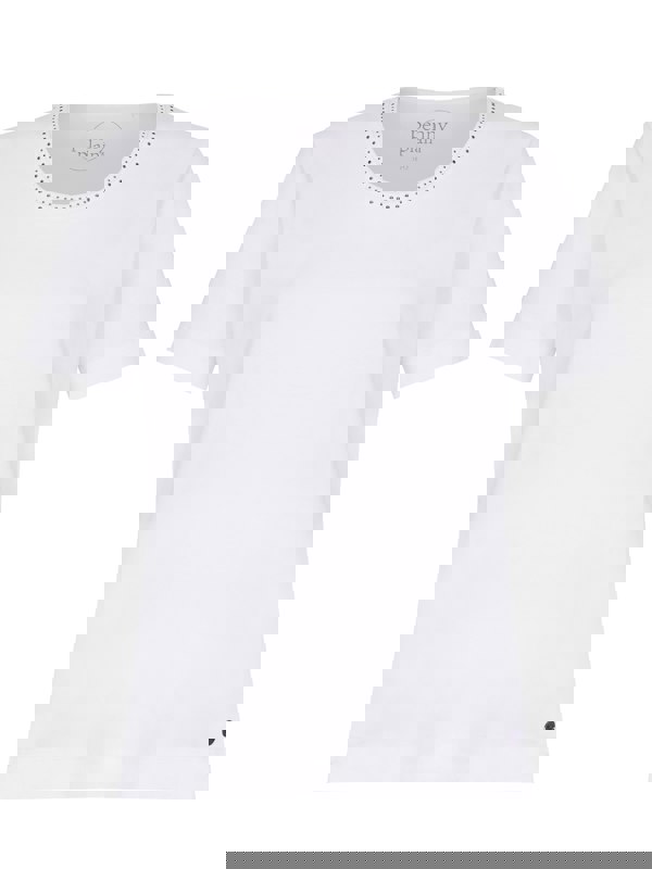 This white double binded, round neck top features pretty nail heads around the neckline and short sleeves. Wear with cropped trousers and a colourful scarf.