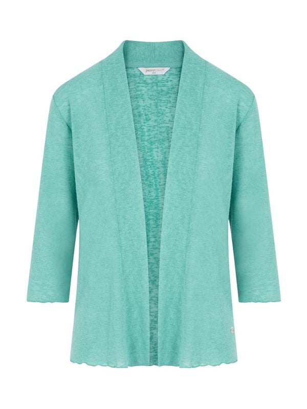 Keep the chill off. This open front shrug features a shawl collar, has three quarter length sleeves and is made from a lightweight jersey in sea green. Wear with a summer dress or short sleeve top.