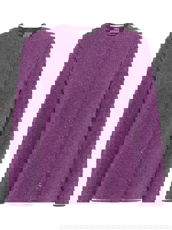 The Ribbed Button Cardigan is a stylish and versatile addition to any wardrobe, featuring a classic ribbed texture in amethyst purple that enhances its visual appeal.