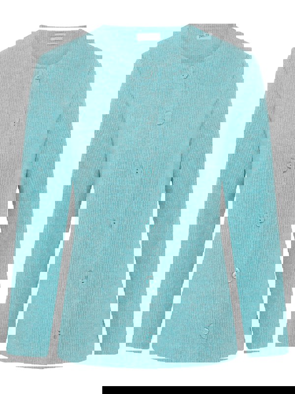 The Ribbed Button Cardigan is a stylish and versatile addition to any wardrobe, featuring a classic ribbed texture in opal blue that enhances its visual appeal.