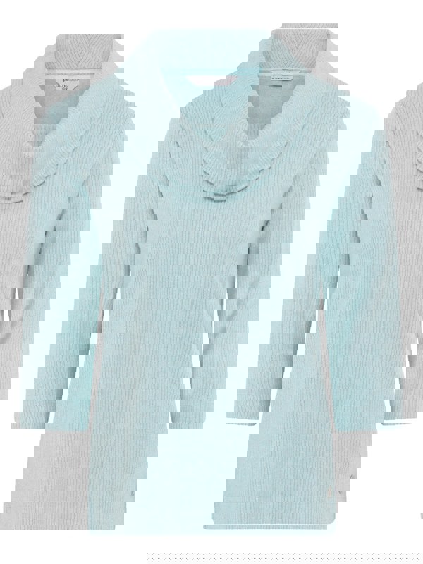Our classic cowl neck top now in a flat back rib construction. Practicality and style in one in a beautiful mint green color. Featuring 3/4 length sleeves and our branded metal tab logo at the hem.