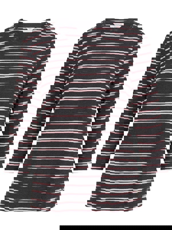 Our essential round neck striped top is made from a beautiful soft cotton blend. The charcoal and dusk colour top features round neck with contrast back neck tab, side slits, three quarter sleeves and metal tab.