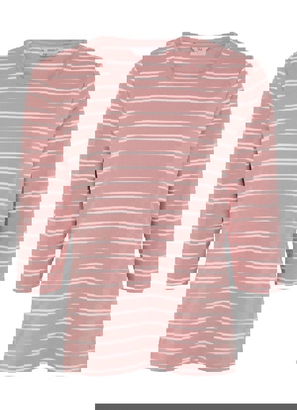 Our essential round neck striped top is made from a beautiful soft cotton blend. The dusk and ivory colour top features round neck with contrast back neck tab, side slits, three quarter sleeves and metal tab.