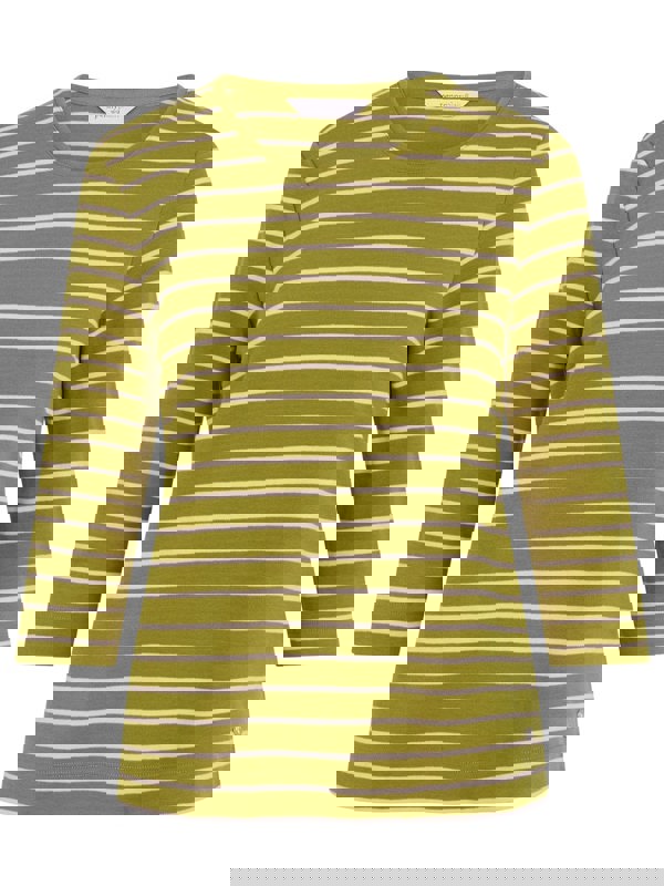 Our essential round neck striped top is made from a beautiful soft cotton blend. The forest and sand colour top features round neck with contrast back neck tab, side slits, three quarter sleeves and metal tab.