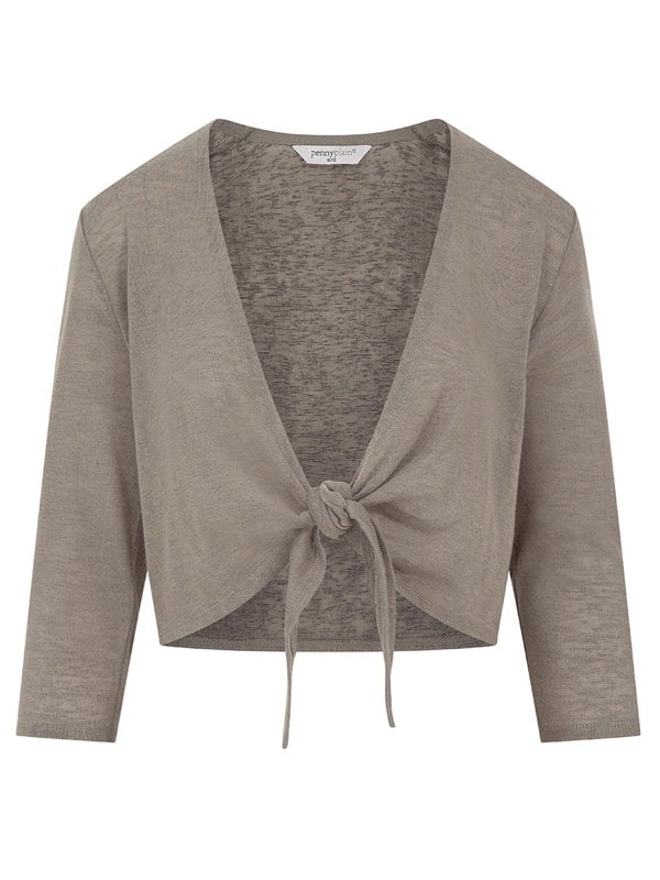 Keep the chill off. This cropped sage shrug features a shawl collar, three quarter length sleeves and is perfect for the warm weather.
