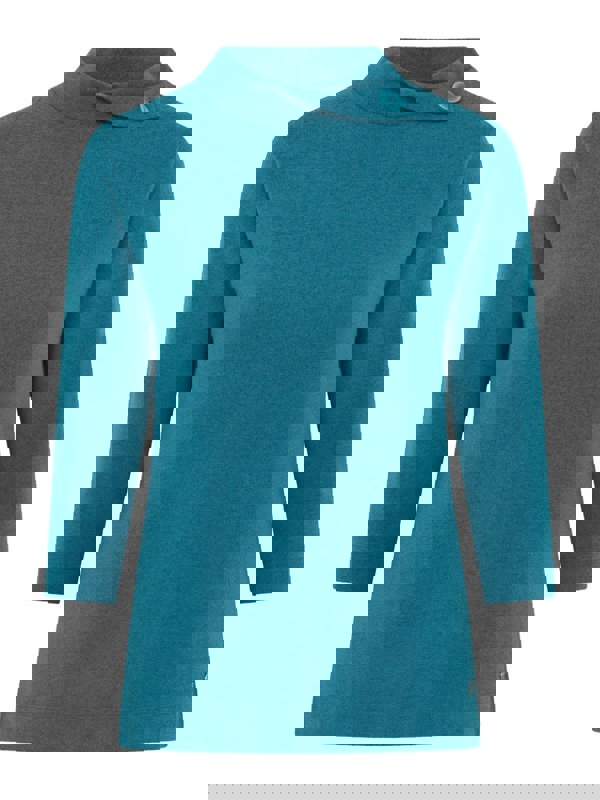Featuring a flattering split turtle neck, the top is curated with our special viscose/poly blend fabric with a hint of stretch for comfort, in a beautiful shade of Dragon Fly and completed with our classic signature brand metal tab detail.