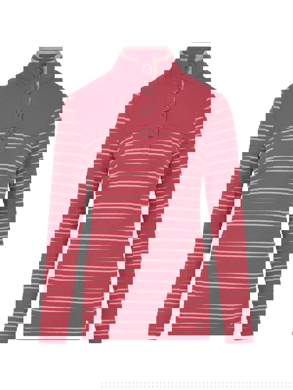 The classic leisure funnel neck top. The berry striped top comes with long sleeves to keep you warm, button down collar, and also features metal tab at the hem. The relaxed fit is perfect for daily activities during chilled days.