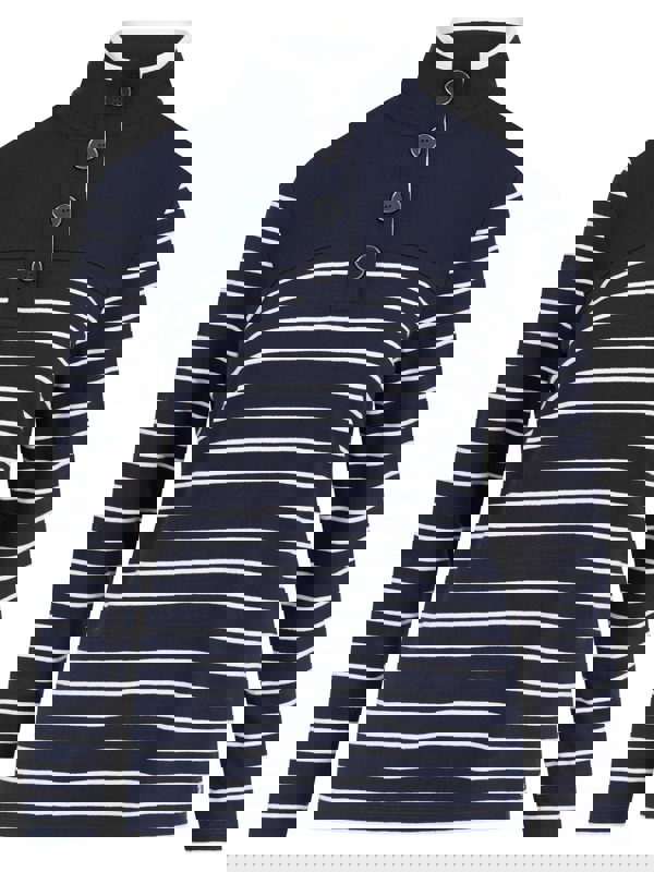 The classic leisure funnel neck top. The french navy and ivory striped top comes with long sleeves to keep you warm, button down collar, and also features metal tab at the hem. The relaxed fit is perfect for daily activities during chilled days.