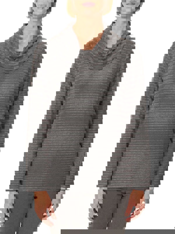 Keep warm with our charcoal iron striped cowl neck top. It features long sleeves, metal tab and side slits, perfect for daily essential wear during this winter.