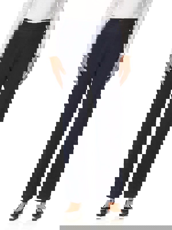 Our stretch for comfort, mid rise treggings in navy features elastic waistband, wide leg for a flattering look and mock pocket with silver bars. Pair with your favourite boots to complete the look. Also available in short length.