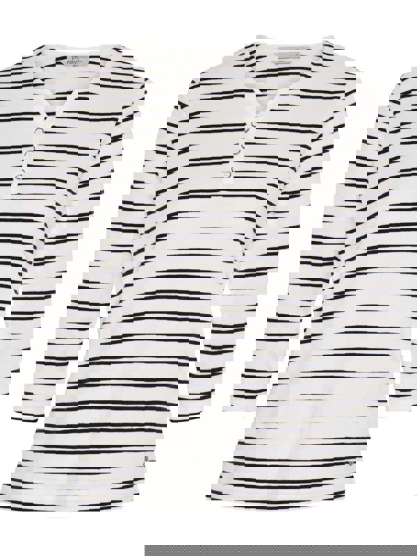 Our Ivory/French Navy yarn dye stripe top is a stylish choice for smart-casual days. It's cut in a flattering shape, with a neat notch neckline 3/4 length sleeves. The versatile piece is complete with a smart 3-button placket.