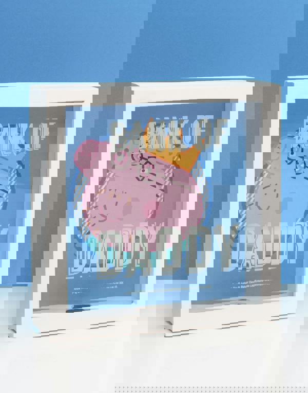 The dads money box comes in a stylish white frame with a glass panel that features a blue background and character print inside.