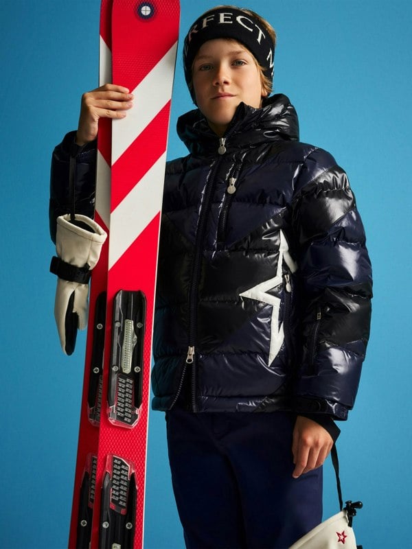 This Perfect Moment kids Super Mojo ski jacket combines blue and black in a fitted, hip-length silhouette. A full-front zip closure and fully lined construction sit alongside 700-fill-power down insulation, with insulation made from duck down and feather. The shell uses a polyamide and polyurethane blend, with separate upper and lower body linings, including recycled polyester in the upper body.