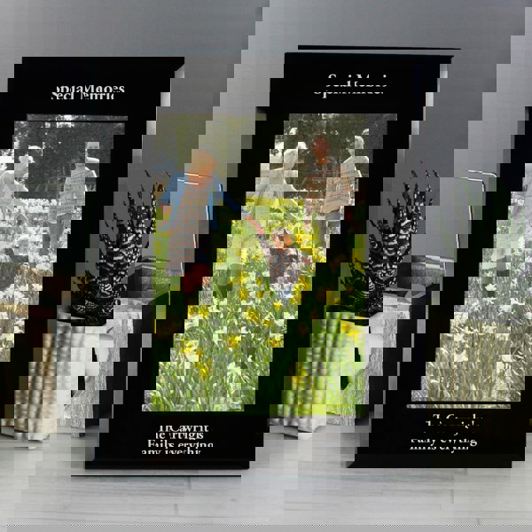 Personalise this Portrait Black Glass Frame with a line above the photo of 25 characters, and two lines below the photo of 30 characters each.