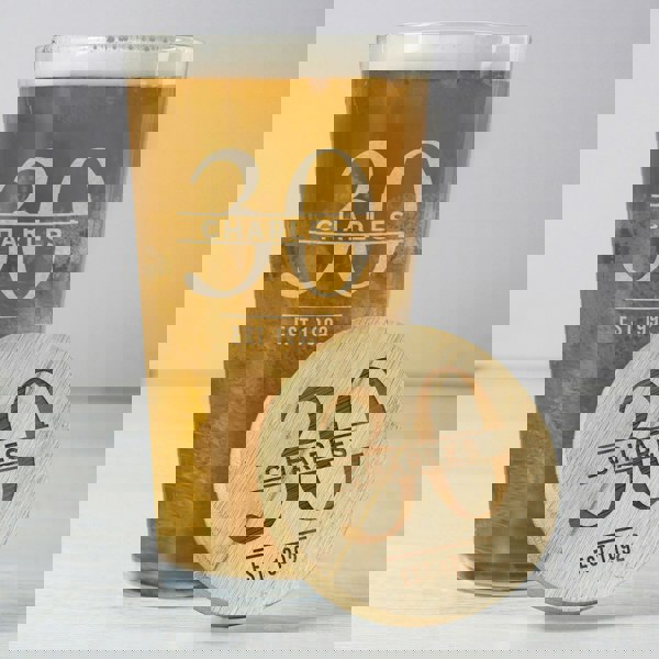 You can personalise this coaster and pint glass with the following, the text entered will appear the same on both items,